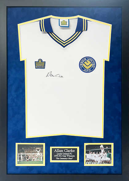Wonderful Leeds United shirt display, signed by legend, Allan Clarke. Clarke, who is nicknamed “Sniffer”, is a former footballer who played in the Football League for Walsall, Fulham, Leicester City, Leeds United and Barnsley, and won 19 international caps for England.