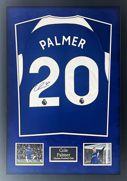 A brilliant shirt display signed by Chelsea dan England star boy, Cole Palmer. Palmer has excelled in his early career at Chelsea and is widely regarded as one of the top talents in the Premier League.