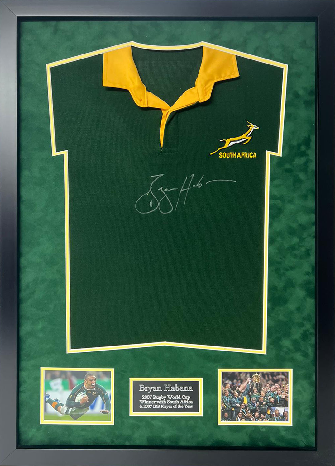 Fantastic shirt display signed by the famous South African rugby player, Bryan Habana. Habana is widely regarded as one of the greatest rugby players of his generation and has achieved numerous accolades throughout his career, including joint-leading try scorer in the Rugby World Cup alongside Jonah Lomu with 15.