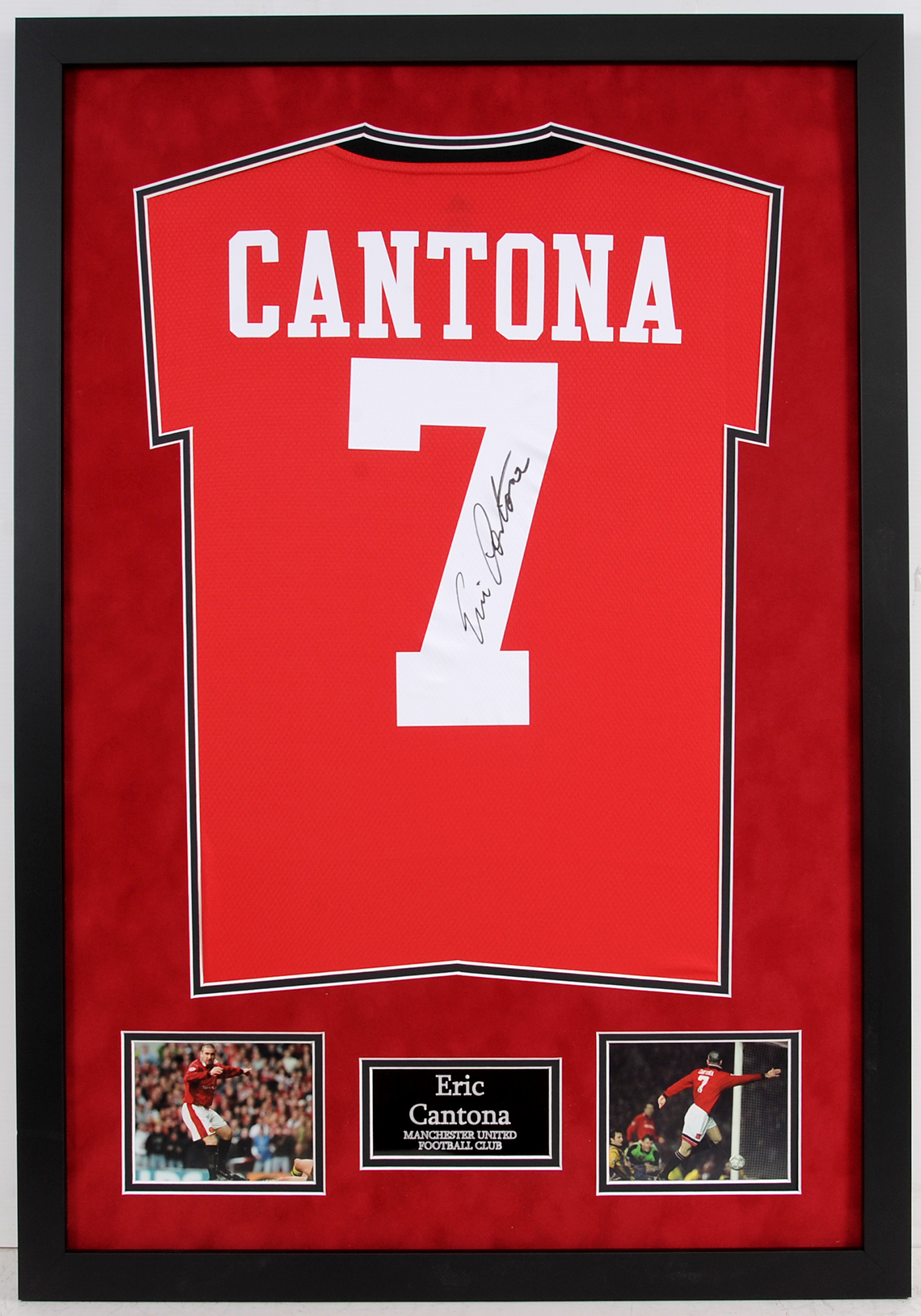 A fantastic signed and framed Eric Cantona shirt. Eric Cantona goes down in History as one of the greatest ever players to wear the Manchester United club crest!