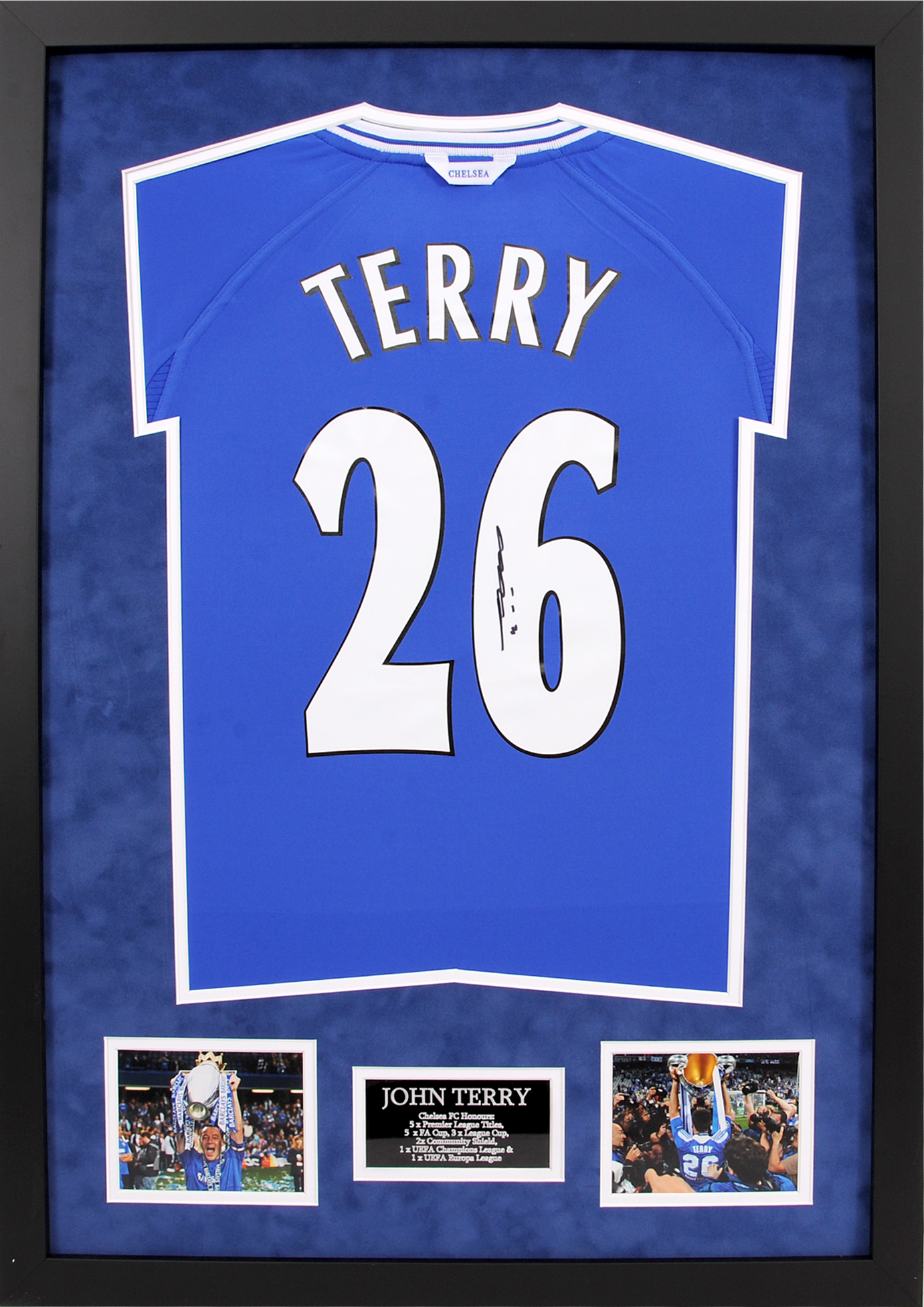 | Fantastic shirt display, signed by John Terry, Chelsea’s most successful captain. During his 19 years with the club, he led them to five Premier League titles, four FA Cups, three League Cups, one UEFA Europa League and one UEFA Champions League title. |