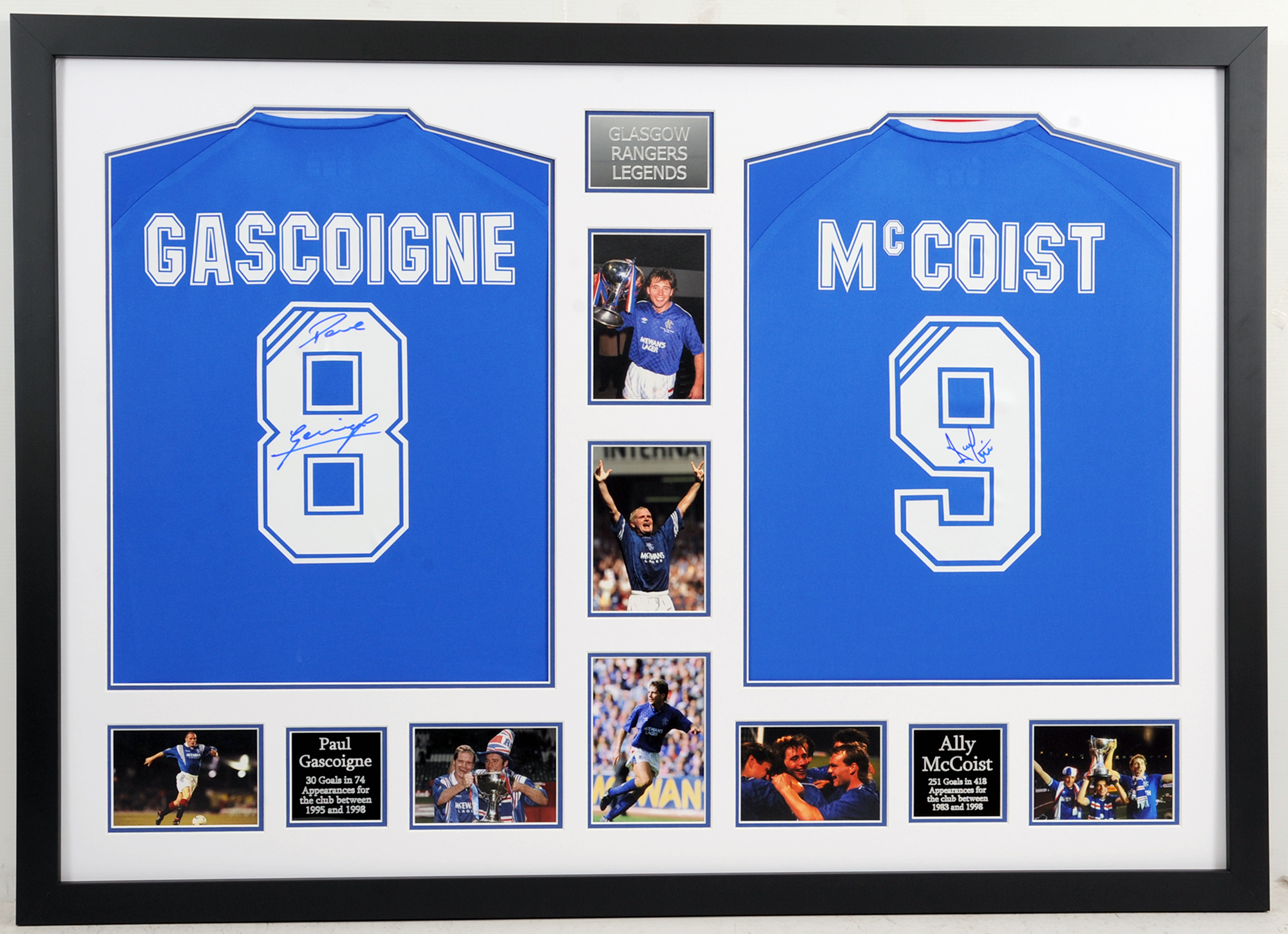 Fantastic double rangers shirt display signed by legends Paul Gascoigne and Ally McCoist.