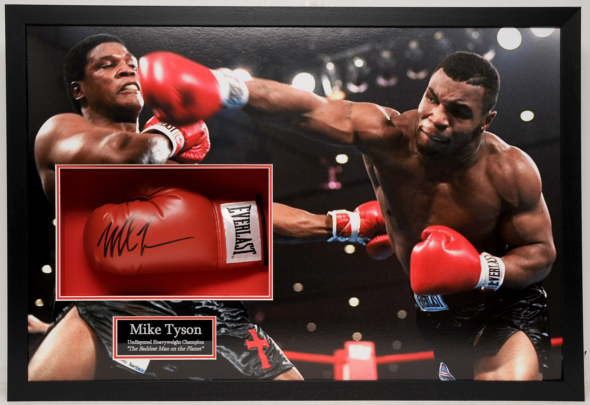 Fantastic signed boxing glove display by “Iron” Mike Tyson. He was the undisputed heavyweight champion and remains the youngest man ever to win the WBC, WBA and IBF world heavyweight titles.