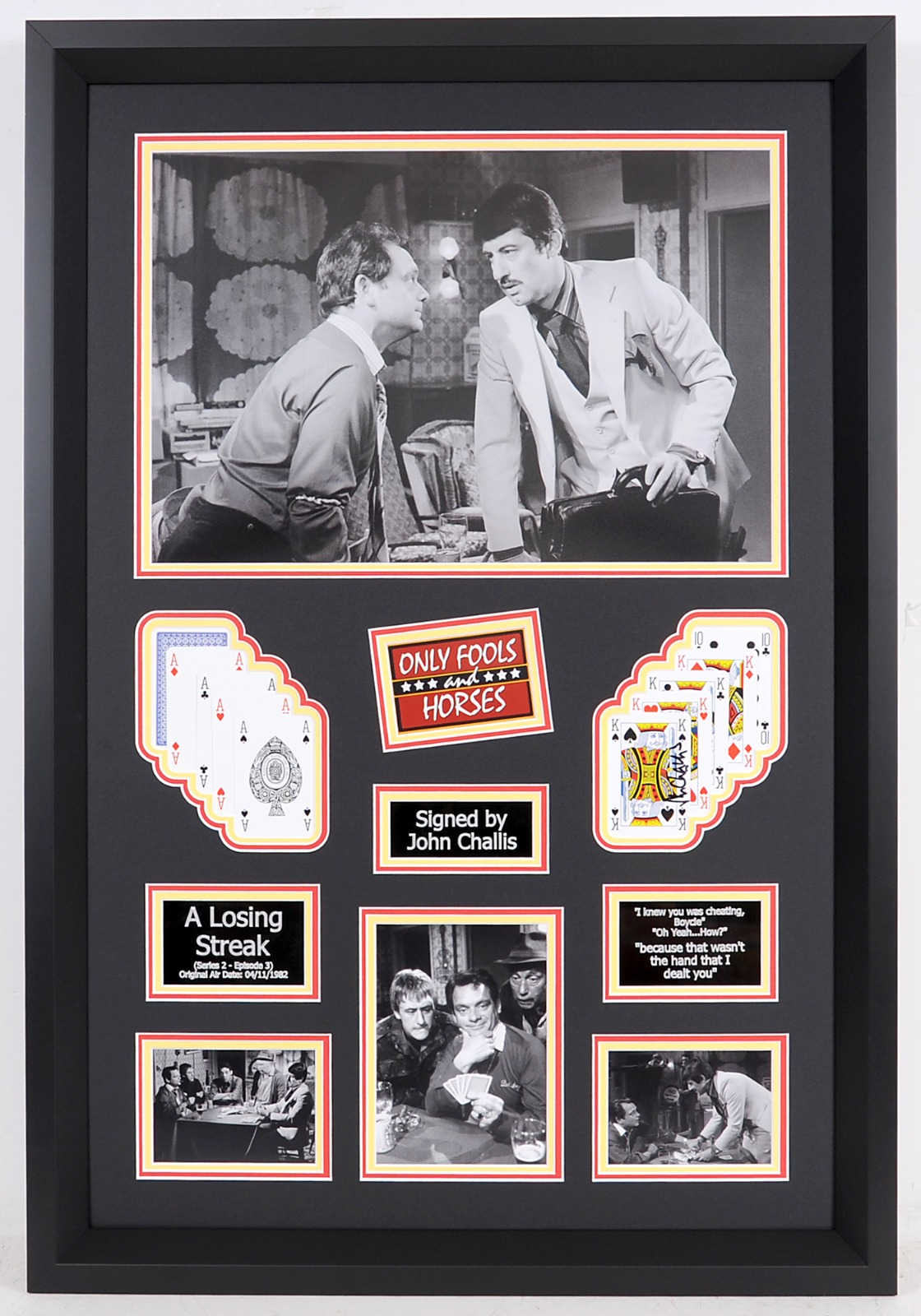 A stunning Only Fools and Horses display signed by John Challis who played the iconic role ‘Boycie’. The display highlights arguably one the greatest scenes in the series labelled ‘The Losing Streak’.