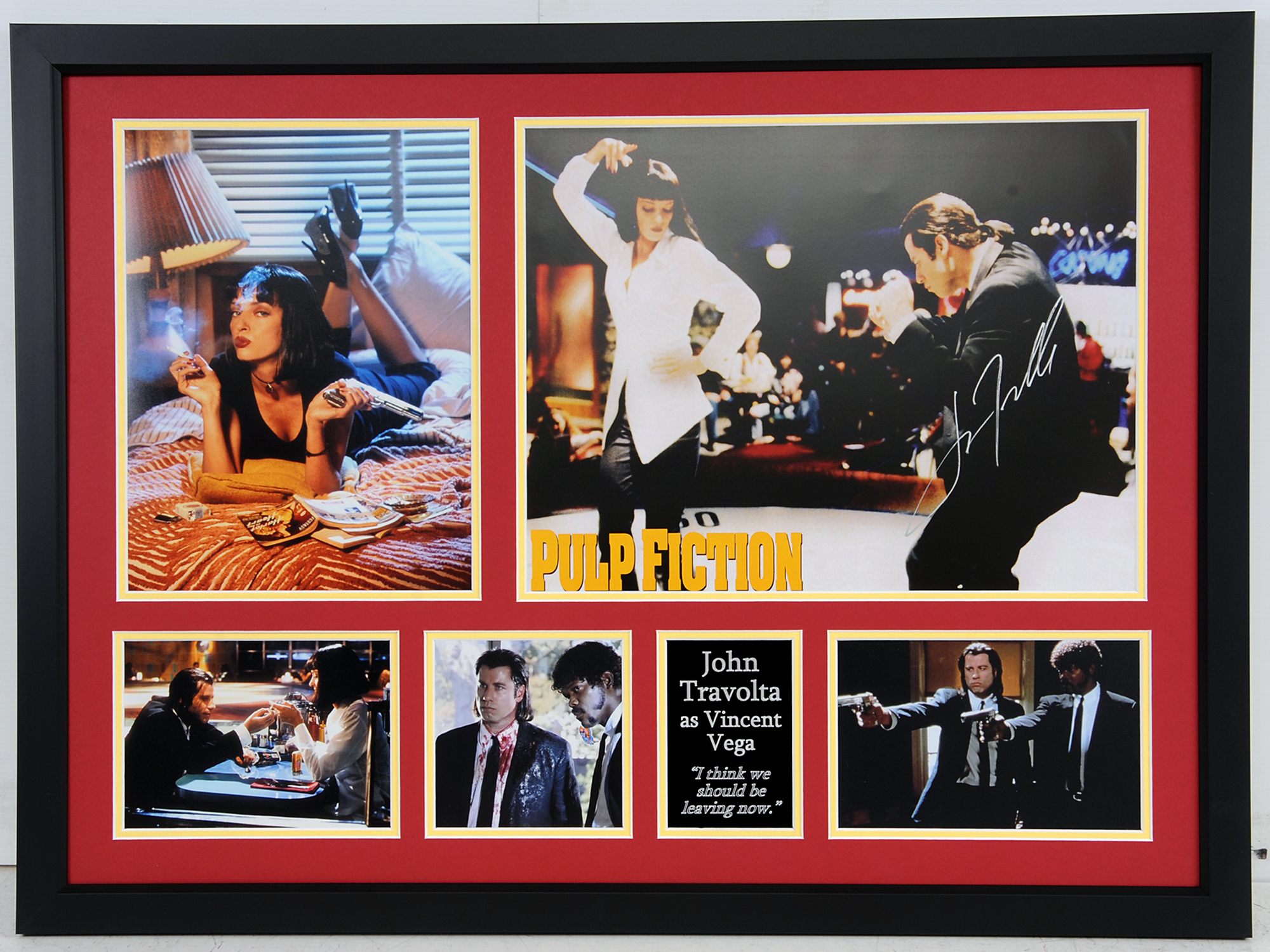 Pulp Fiction, directed by Quentin Tarantino was a major success. It was nominated for seven awards at the 67th Academy Awards, including Best Picture, and won Best Original Screen play starring John Travolta, Samuel L. Jackson, Bruce Willis, Tim Roth, Ving Rhames, and Uma Thurman, it tells several stories of criminal Los Angeles. This amazing display is signed by John Travolta who played Vincent Vega.