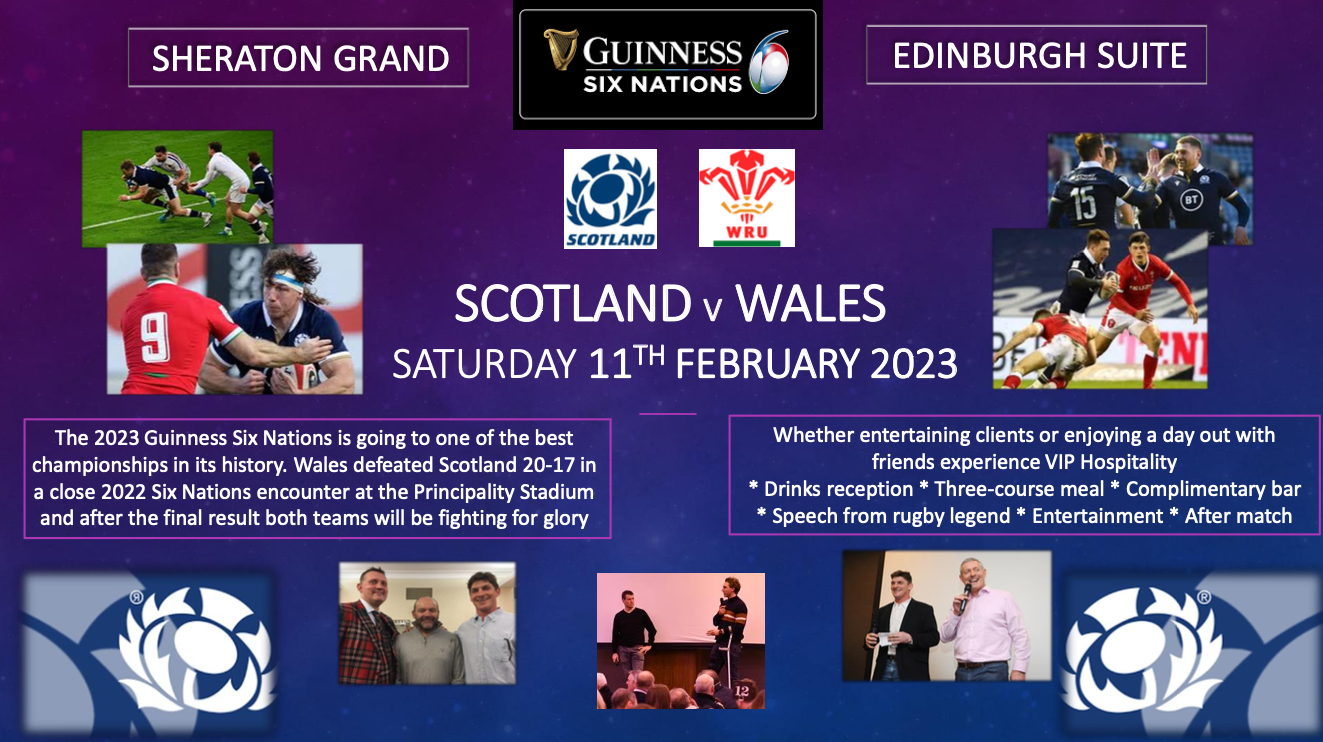 Whether entertaining clients or enjoying a day out with friends, experience VIP Hospitality for two for Scotland v Wales on Saturday 11th February. Entertain clients or enjoy a day out with friends at the iconic Sheraton Grand Hotel, Edinburgh Suite.