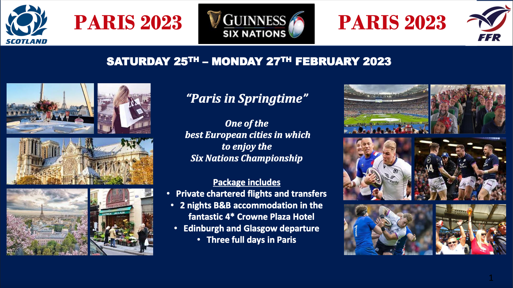 Saturday 25th - Monday 27th March 2023. Paris is one of the best European Capitals in which to enjoy the Six Nations Championship. Join DAB events on this fantastic weekend break and soak up the atmosphere with this package for two people: