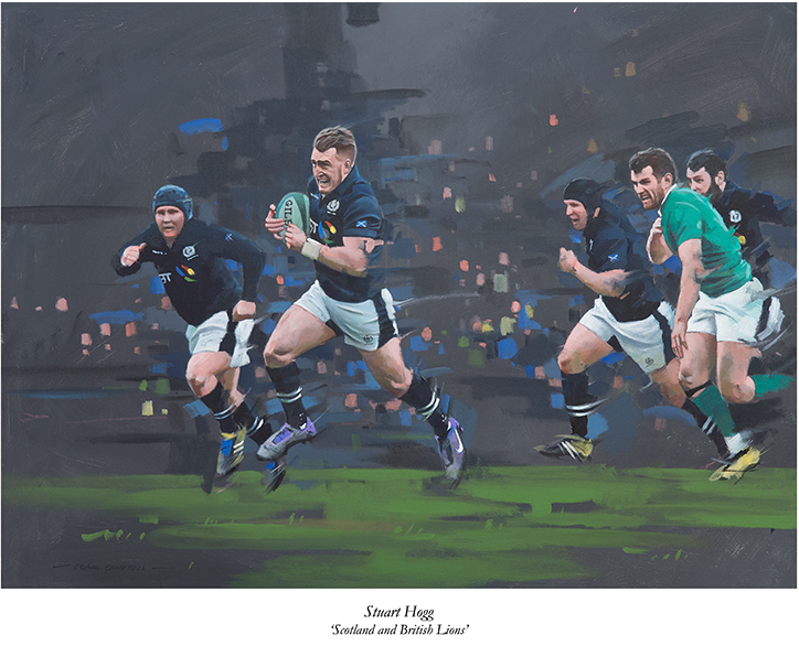 Renowned Scottish artist Craig Campbell, who is a wonderful supporter of the Bill McLaren Foundation created this painting of Stuart Hogg running fast for the line in the opening match of the 2017 Six Nations, when Scotland narrowly won against Ireland 27-22. Stuart scored twice in the game and played an unforgettable man of the match performance. -