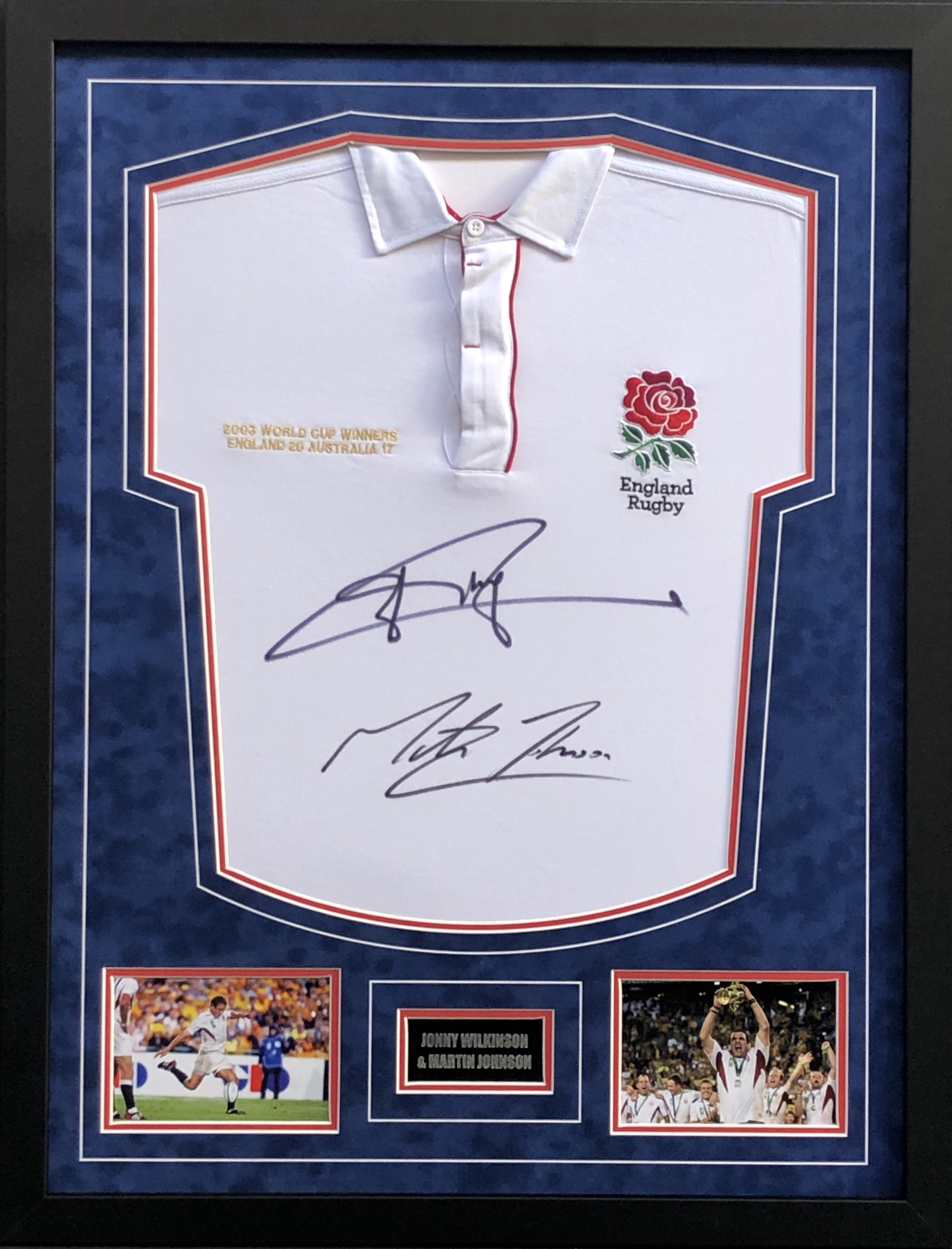 Brilliant shirt display signed by legendary 2003 World Cup winners, Jonny Wilkinson and Martin Johnson.