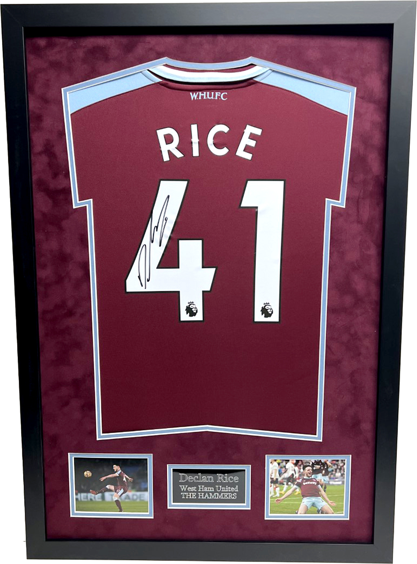 A fantastic, signed shirt display of West Ham and England footballer Declan Rice. The Hammers captain played a huge role in the England 2022 World Cup campaign.