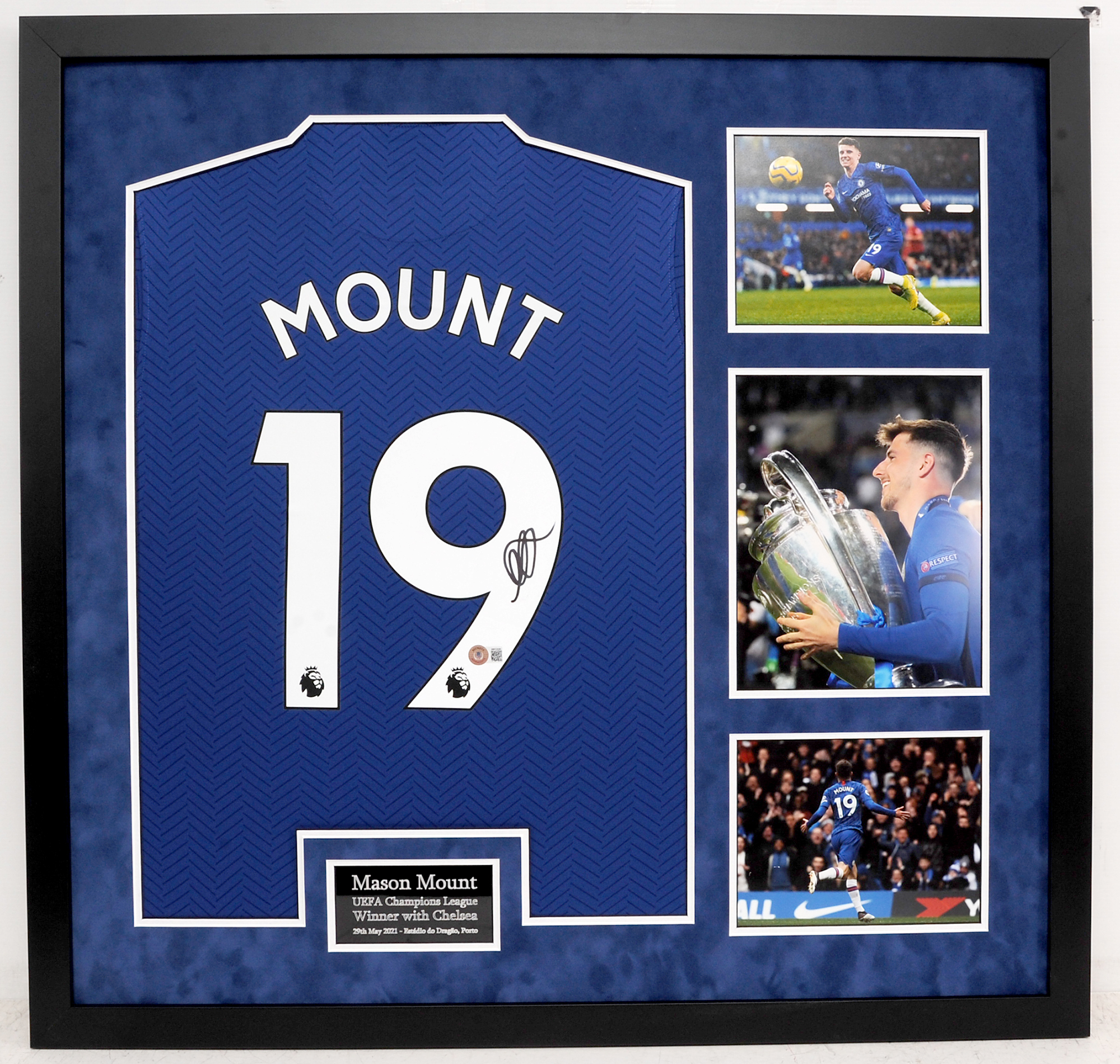 Stunning Mason Mount signed shirt display. Mount plays as an attacking or central midfielder for Premier League club Chelsea and the England national team.