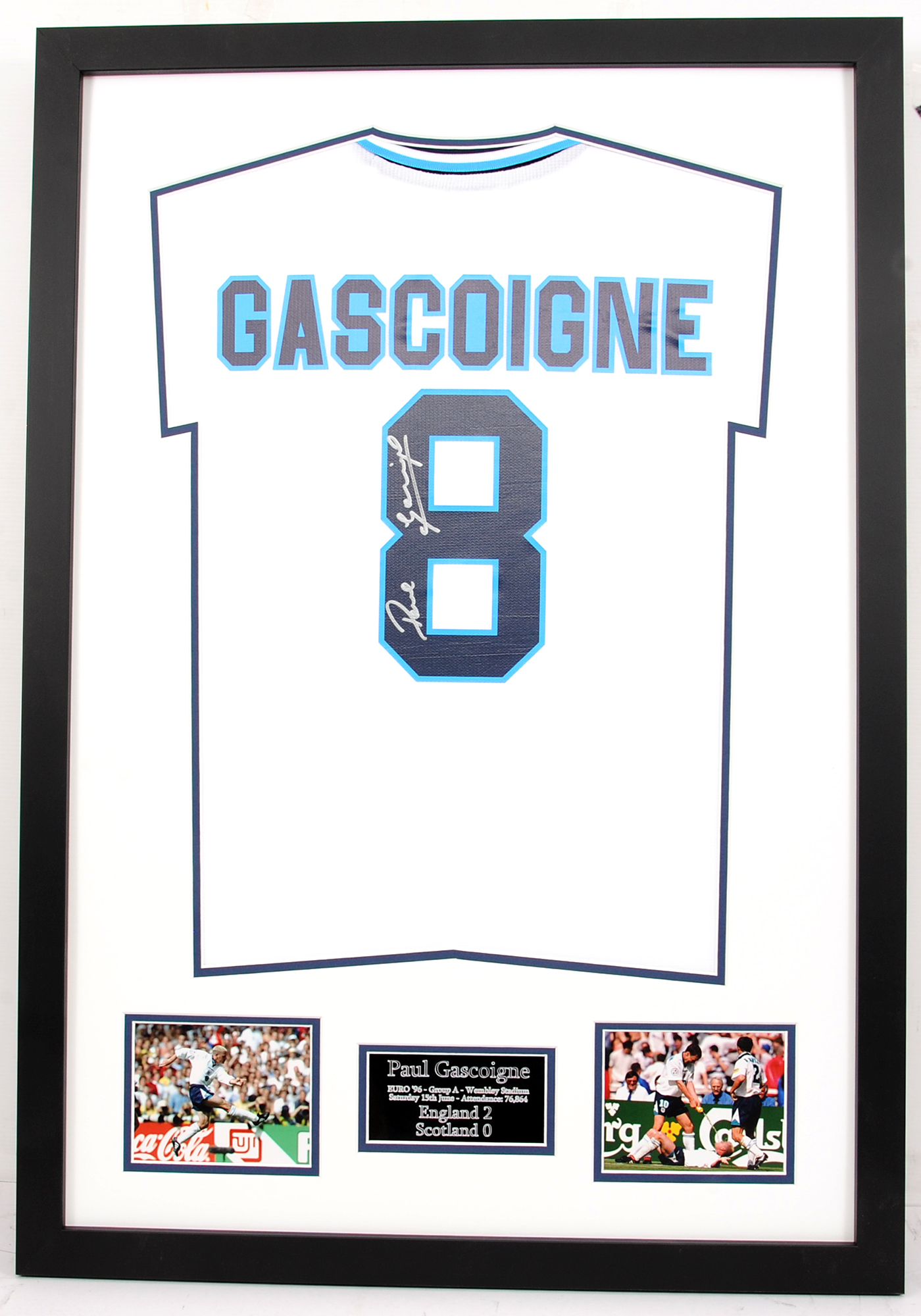 Brilliant shirt display signed by former England football legend Paul Gascoigne. Gascoigne was one of the most gifted players ever to wear the England jersey.