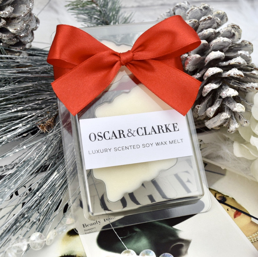 Our Christmas Tree Wax Melts have 3 tree shaped wax melts in Cranberry, Orange & Cinnamon fragrance. These beautiful wax melts are wrapped with an oversized red satin ribbon making them perfect for a festive present for a loved one or for yourself.