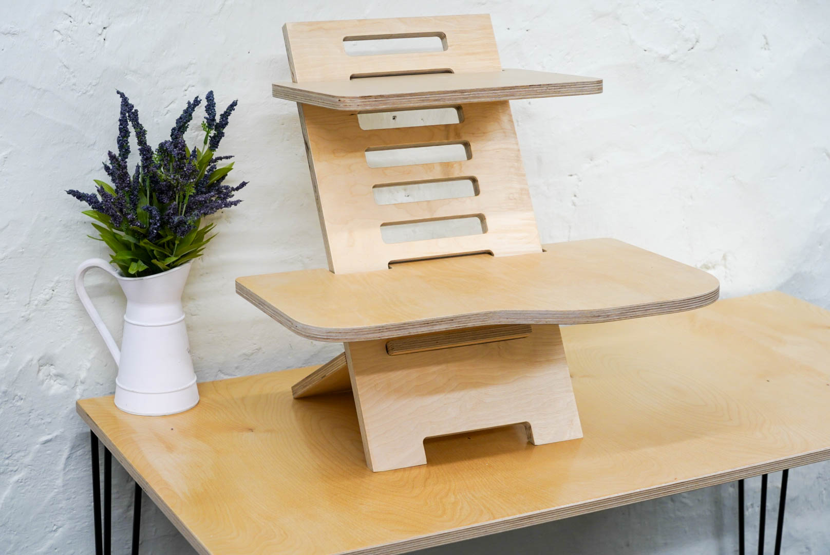 The easy way to convert your desk. Heskie Deskie is handcrafted to be mobile, versatile, strong and stylish. Features: 8 slot ladder for easy height adjustment 2 shelves as standard for your devices (wider shelf version for numerical keypad, or extra space if needed) Strong & smooth 18mm birch plywood material Quick change from sitting to standing ミ shelves simply slot in and out Easy to assemble and pack away. No screws or fixings Sits on your existing desk or work surface at home or work. Stores completely flat Compact - easily fits on your existing desk and folds flat for easy storage (see picture for measurements) Fits most monitor sizes (maximum stand width on top shelf 36cm) Holds the weight of monitors/printer/laptops Available in left or right handed versions Free shipping Heskie products are entirely handmade from start to finish in a small workshop near Ripon. I have over 25 years experience as a carpenter in film and theatre and am focusing all my time on designing and making the perfect standing desk. For me, it is important that the desks look good as an item of furniture, as well as solve an important problem - we weren't designed to sit at a desk all day!
